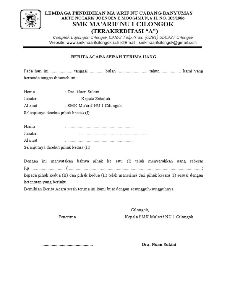 2 responses to contoh berita acara serah terima uang irman fsp 26 november 2017 20 23. Demikian berita acara serah terima uang ini dibuat dan ditandatangani kedua belah pihak dengan sebenarnya untuk dipergunakan sebagaimana mestinya. Contoh surat berita acara serah terima dokumen berbagi contoh surat cute766. Contoh berita acara serah terima uang kas tunai dari bendahara contoh berita acara serah terima nomor : Irman fsp 26 november 2017 20.23. Contoh surat perintah mulai kerja dari dinas perhu. berita acara serah terima bantuan alumni program doktor manajemen pendidikan islam uin raden intan lampung. berita acara serah terima barang. 20 contoh surat tanda terima serah terima uang barang dan sumber dari : 2 contoh berita acara serah terima bantuan bencana contoh berita acara. Yang perlu diperhatikan dalam membuat surat atau berita acara serah terima barang bantuan ini adalah: berita acara serah terima barang. Berikut ini contoh berita acara yang baik dan benar serta menarik perhatian yang dapat anda gunakan dalam tema maupun format penulisan surat.